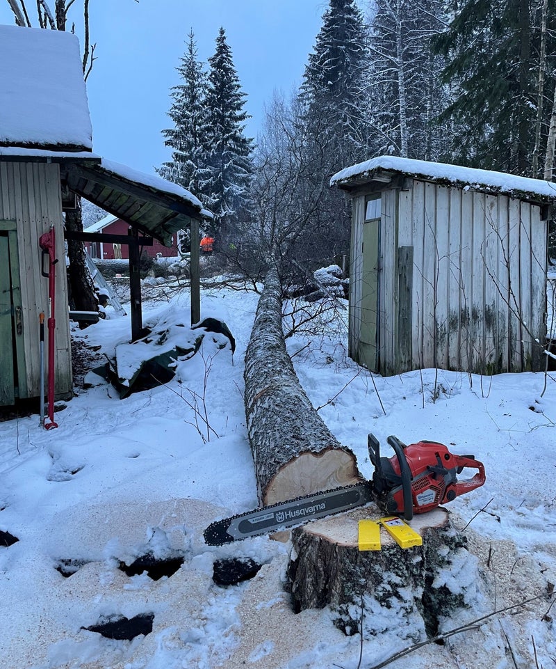 Kuvan kaltaiset puut saadaan alas oikeilla työkaluilla ja nipulla konsteja. Monesti varsinkin mökeille ei pääse millään nosturilla tai työkoneella tarpeeksi lähelle, vaikkakin käsityökaluin suoritettava puun poisto on ainoa vaihtoehto niin se on silti yllättävän kustannustehokas.